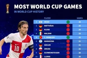 当前位置: 首页 > 资讯 > 足球资讯 > 世界杯历史出场排名:梅西26场最多,C罗22场、莫德里奇19场